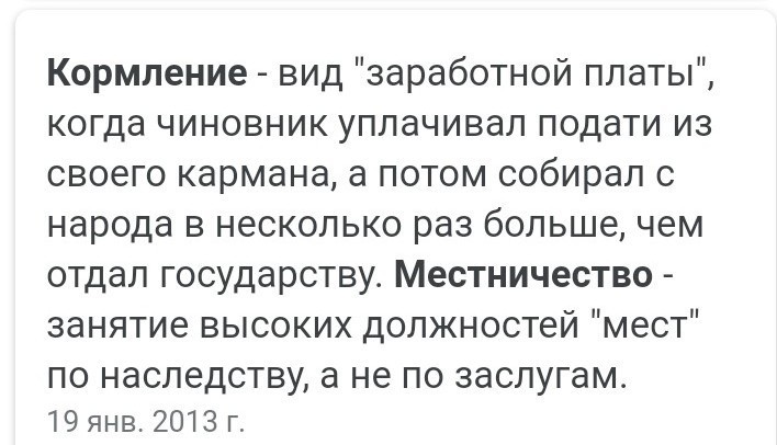 Кормление - вид "заработной платы", когда чиновник уплачивал подати из своего кармана, а потом собирал с народа в несколько раз больше, чем отдал государству.