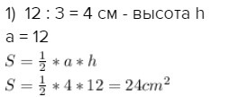Сторона треугольника равна 12 см, а высота, проведенная к ней, в три раза меньше стороны. Найдите площадь треугольника.
