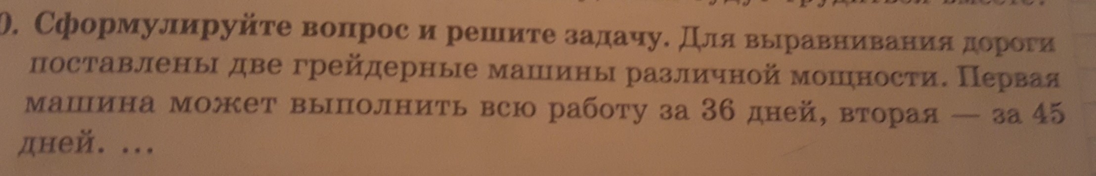 вопрос. За сколько дней могут выполнить всю работу две машины, работая вместе? Решение . Производительность 1 машины 1/36, 2-й машины 1/45, общая произв-ть 1/36+1/45=9/180=1/20, всю работу примем за 1, тогда 1: 1/20=20 дней