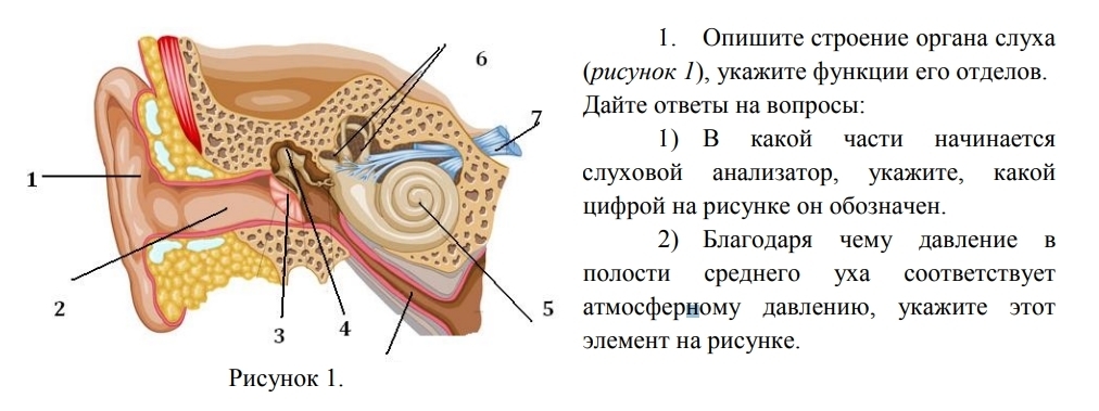 1. Опишите строение органа слуха (рисунок 1), укажите функции его отделов. Дайте ответы на вопросы: 1) В какой части начинается слуховой анализатор, укажите, какой цифрой на рисунке он обозначен. 2) Благодаря чему давление в полости среднего уха соответствует атмосферному давлению, укажите этот элемент на рисунке.