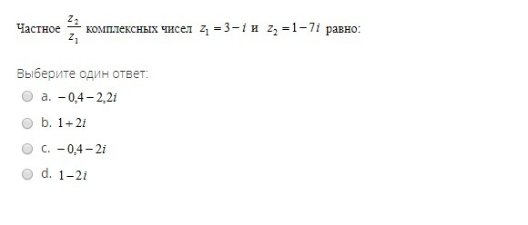 (1-i7) / (3-i) = (3 - i21 + i + 7) / 10 = 1 - i2. Ответ d.
