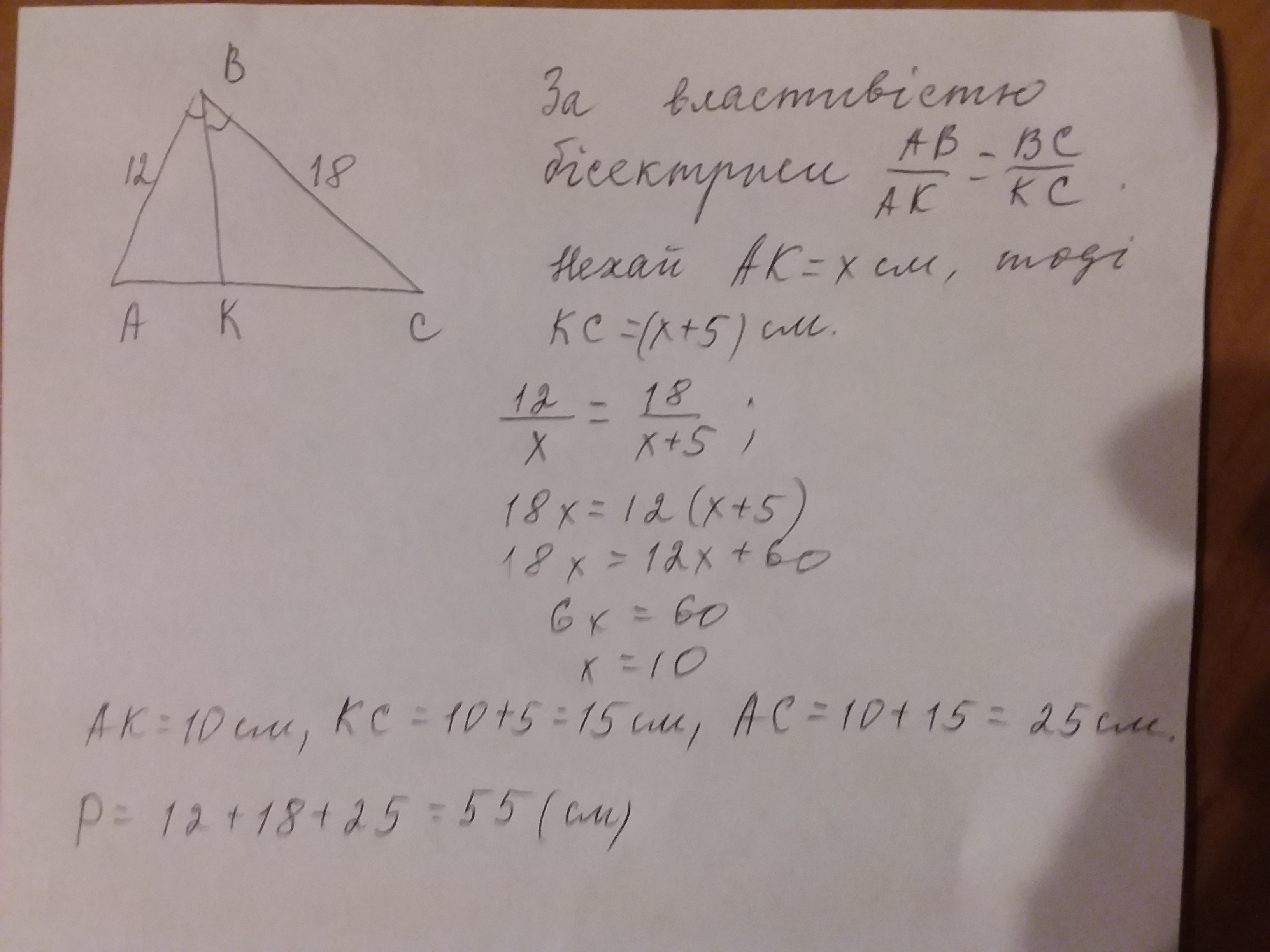 Дві сторони трикутника дорівнюють 12 см і 18 см, бісектриса кута між ними ділить третю сторону на відрізки, різниця між якими дорівнює 5 см. Знайдіть периметр трикутника. + малюнок