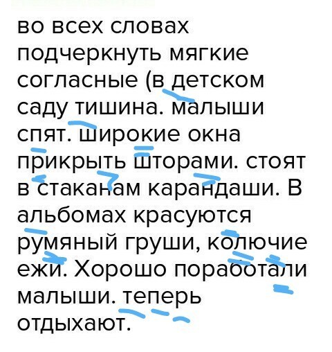 во всех словах подчеркнуть мягкие согласные (в детском саду тишина. малыши спят. широкие окна прикрыть шторами. стоят в стаканам карандаши. В альбомах красуются румяный груши, колючие ежи. Хорошо поработали малыши. теперь отдыхают.