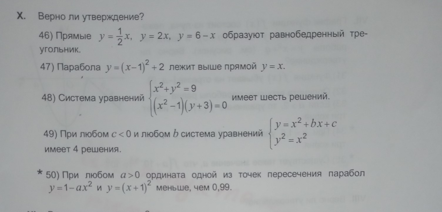 49. Да. Две перпендикулярные прямые проходящие через начало координат и пересекающие оси координат под углом 45 градусов, обязательно пересекутся с параболой, направленной вверх и пересекающей ось у при отрицательном значении в 4 точках.