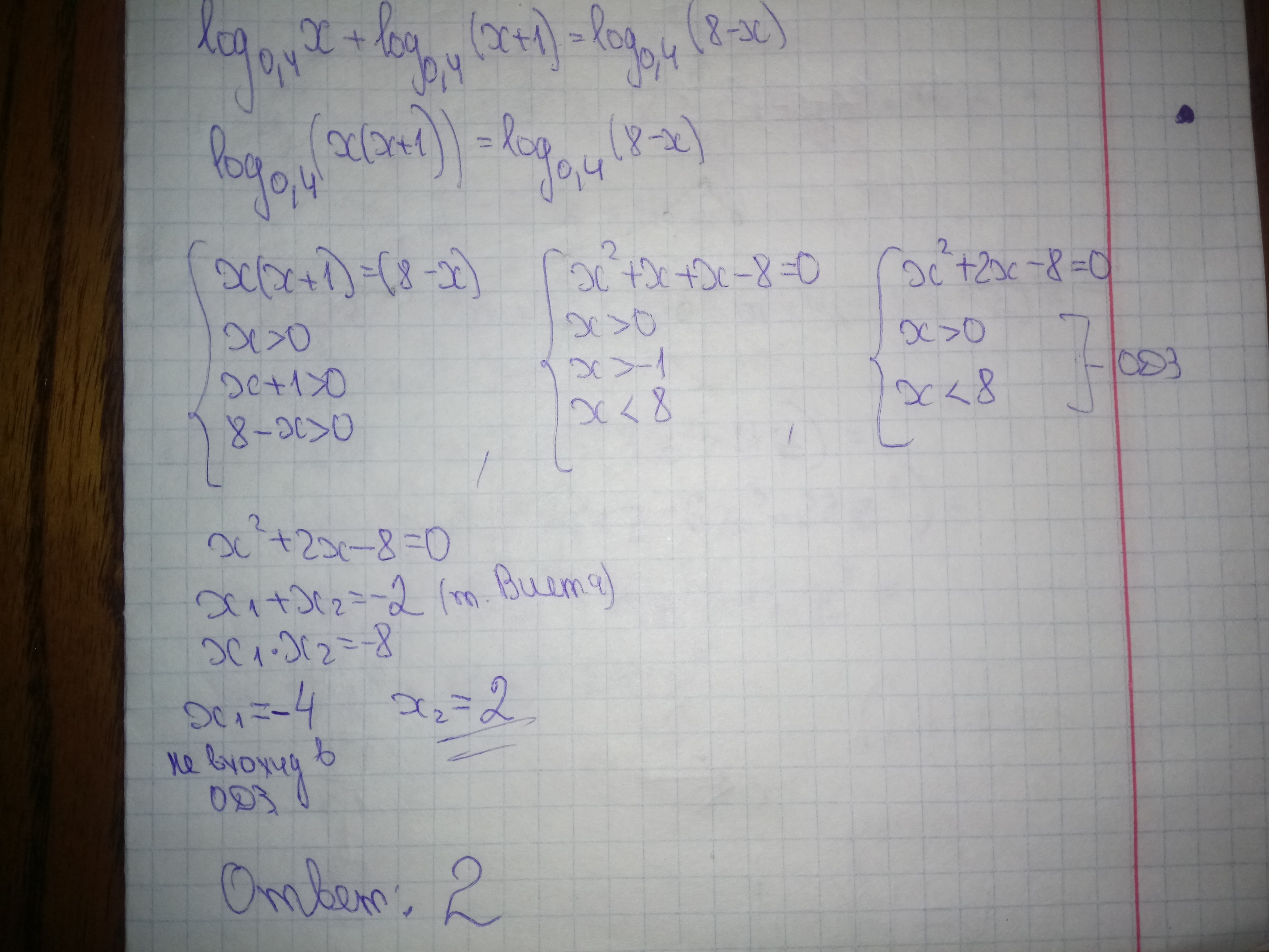 Log 0,4 (x2+x)=Log 0,4 (8-х)