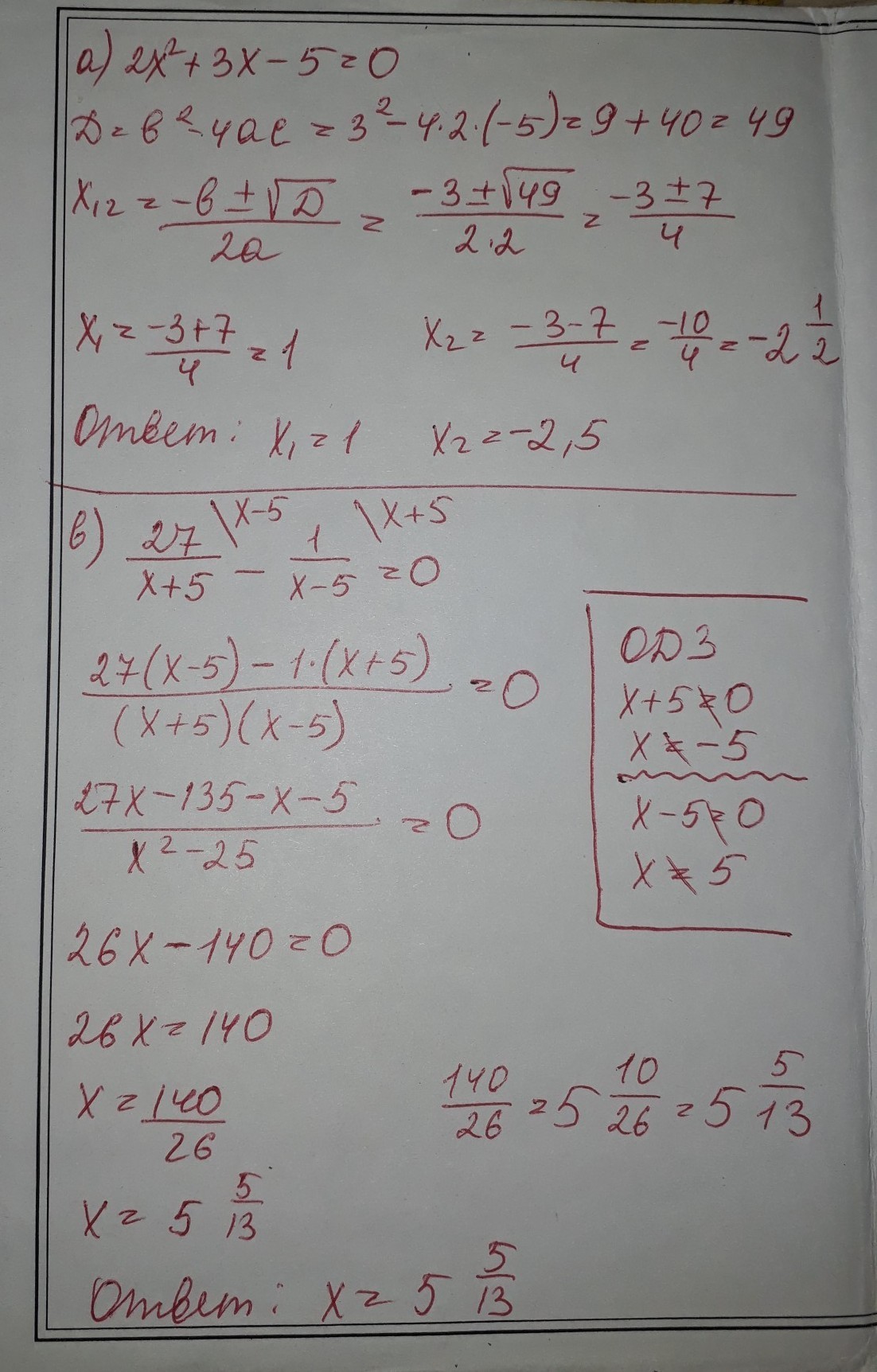 b) 27/(x+5)-1/(x-5) = 0