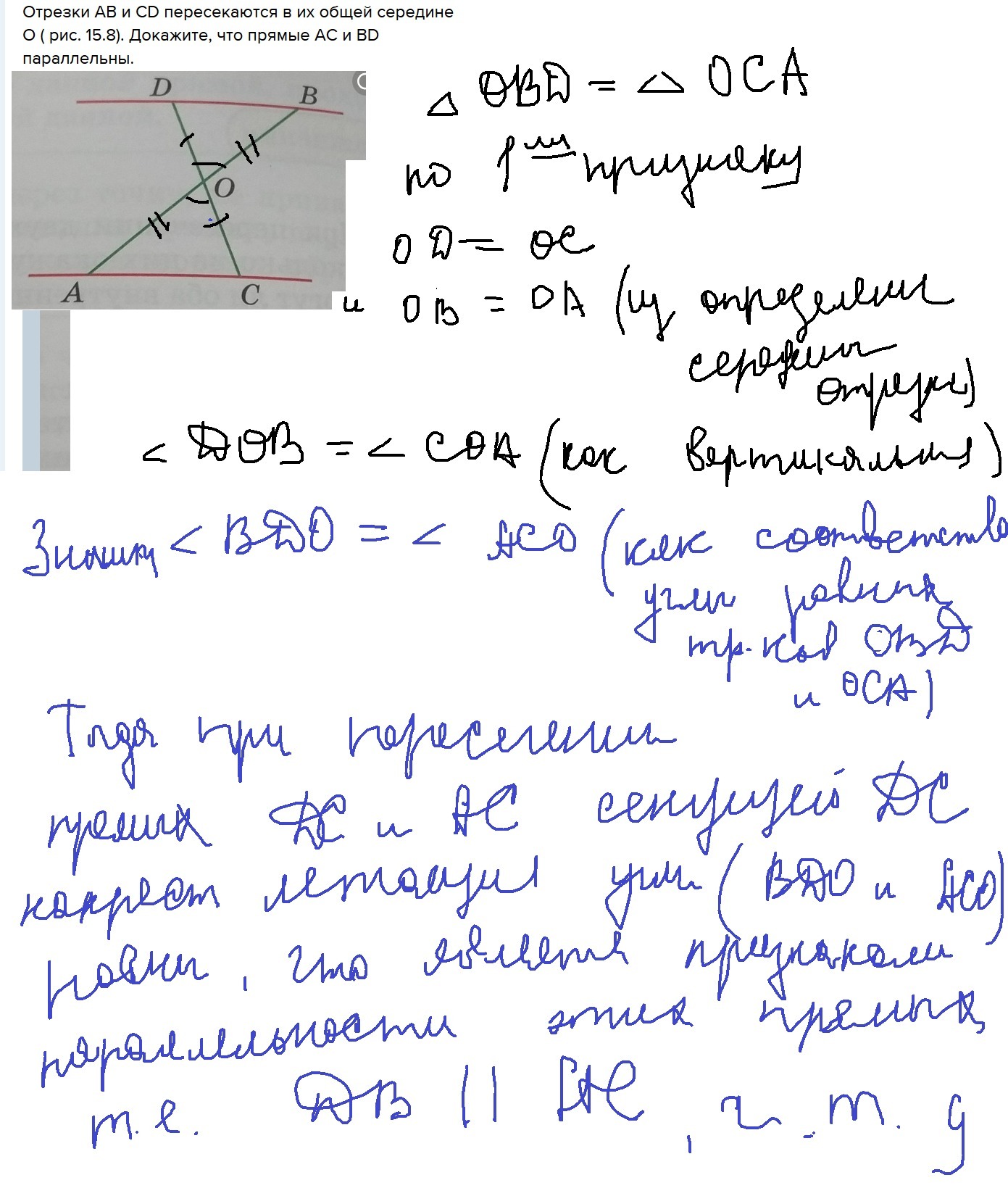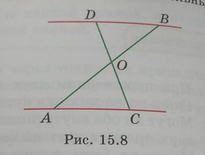 отрезки AB и CD пересекаются в их общей середине О ( рис. 15.8). Докажите, что прямые AC и BD параллельны.