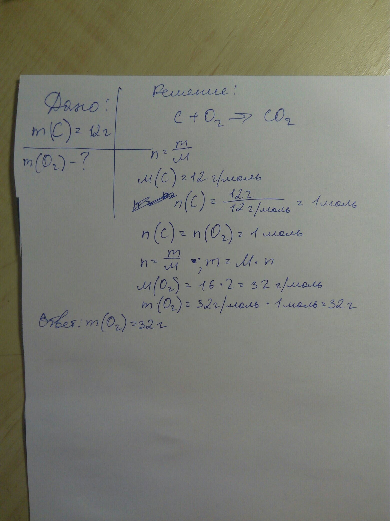 при полном сгорании 12 г графита образовалось 44 г углекислого газа. какая масса кислорода прореагировала с графитом?