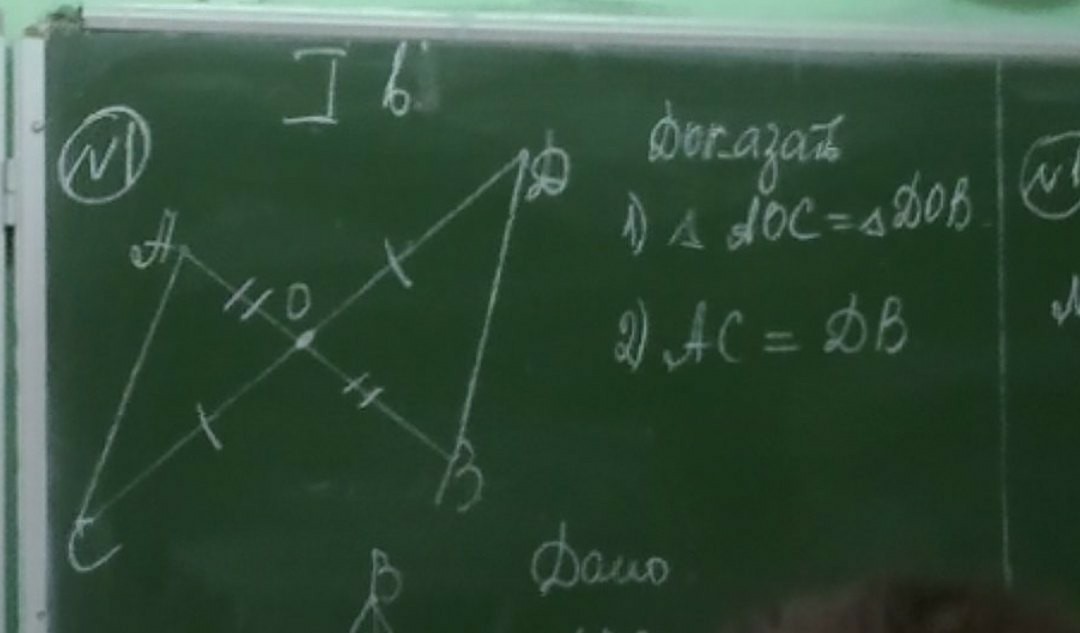 ∠АОС=∠ВОД--как вертикальные, ΔАОС=ΔВОД по 1-му признаку равенства Δ-ов, значит АС=ВД.