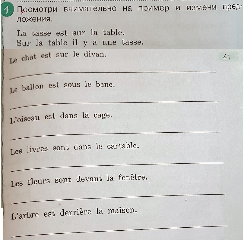 1) sur le canapé chat 2) sous le banc balle 3) dans la cage d'oiseau 4) dans le sac de livre 5) sur la fenêtre de fleurs 6) derrière l'arbre de la maison