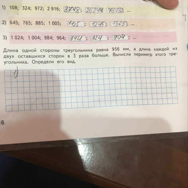 Длина одной стороны треугольника равна 956 мм, а длина каждой из двух оставшихся сторон в три раза больше. Вычисли периметр этого треугольника. Определи его вид.