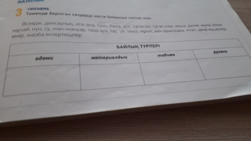 материалдық : ақша, мұнай, күн, су, тау, үй.