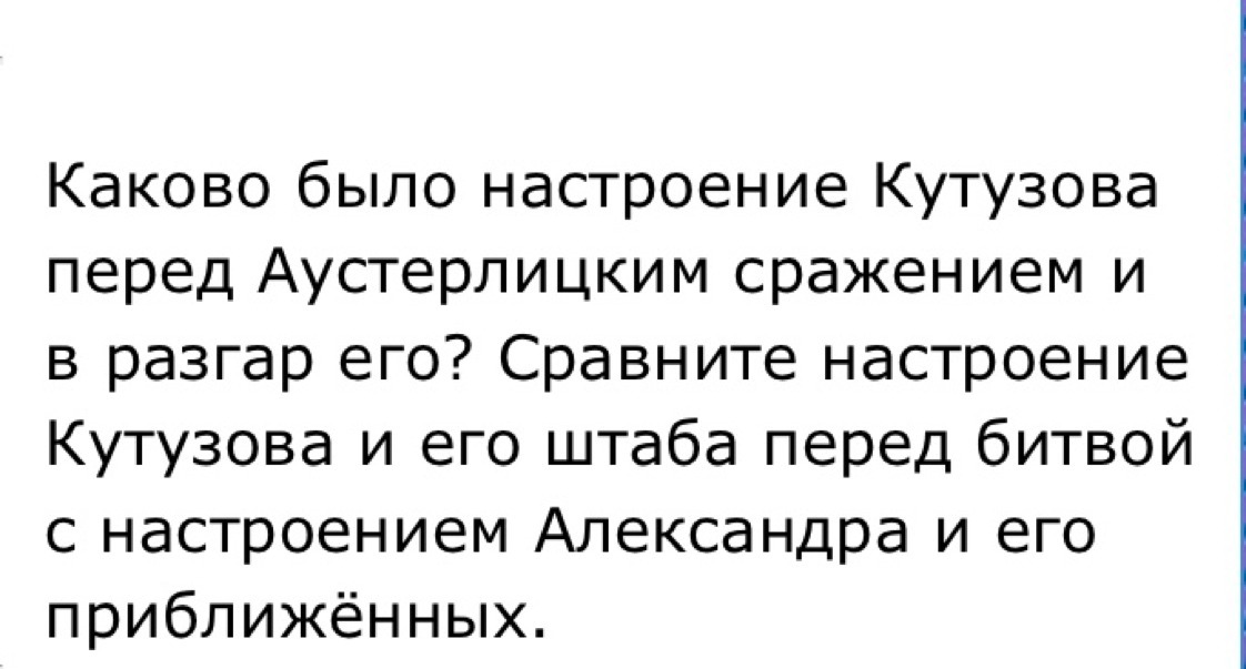 У Кутузова «злое и едкое выражение лица» , он «желчно смеется» . Вот приближается император со свитой: «Как будто через растворенное окно вдруг пахнуло свежим полевым воздухом и душную комнату, так пахнуло на невеселый кутузовский штаб молодостью, энергией и уверенностью в успехе от этой прискакавшей блестящей молодежи» . Два восприятия предстоящей битвы: одно — легкое, радостное; другое — мрачное, даже брюзгливое. В свете последующих событий становится ясной авторская мысль, его отношение к тому и другому лагерю: легкомыслие императора граничит с преступлением; Кутузов же испытывает неподдельное горе, думая о людях, которые должны погибнуть, о русской армии, ожидающем ее позоре.