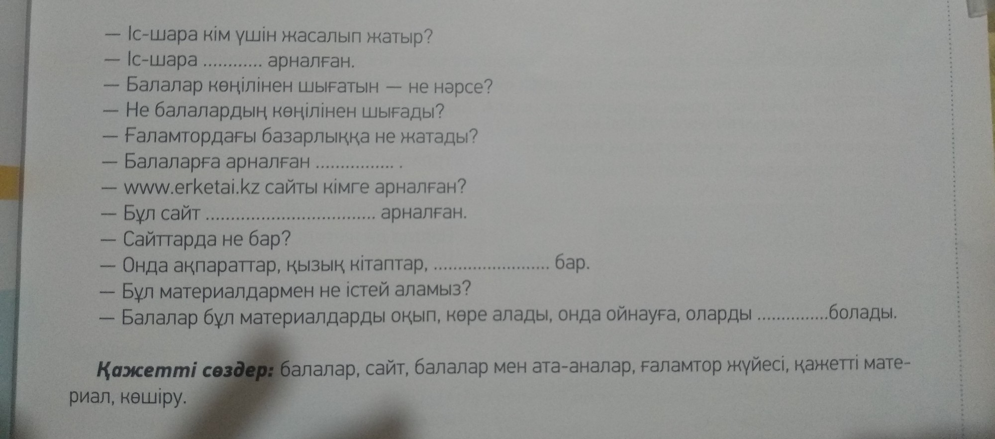 Көп нүктенің орнына қажетті сөзді, диалогті толықтырып оқыңдар. Өзің қажет деп тапқан сөйлемдерді жаз.