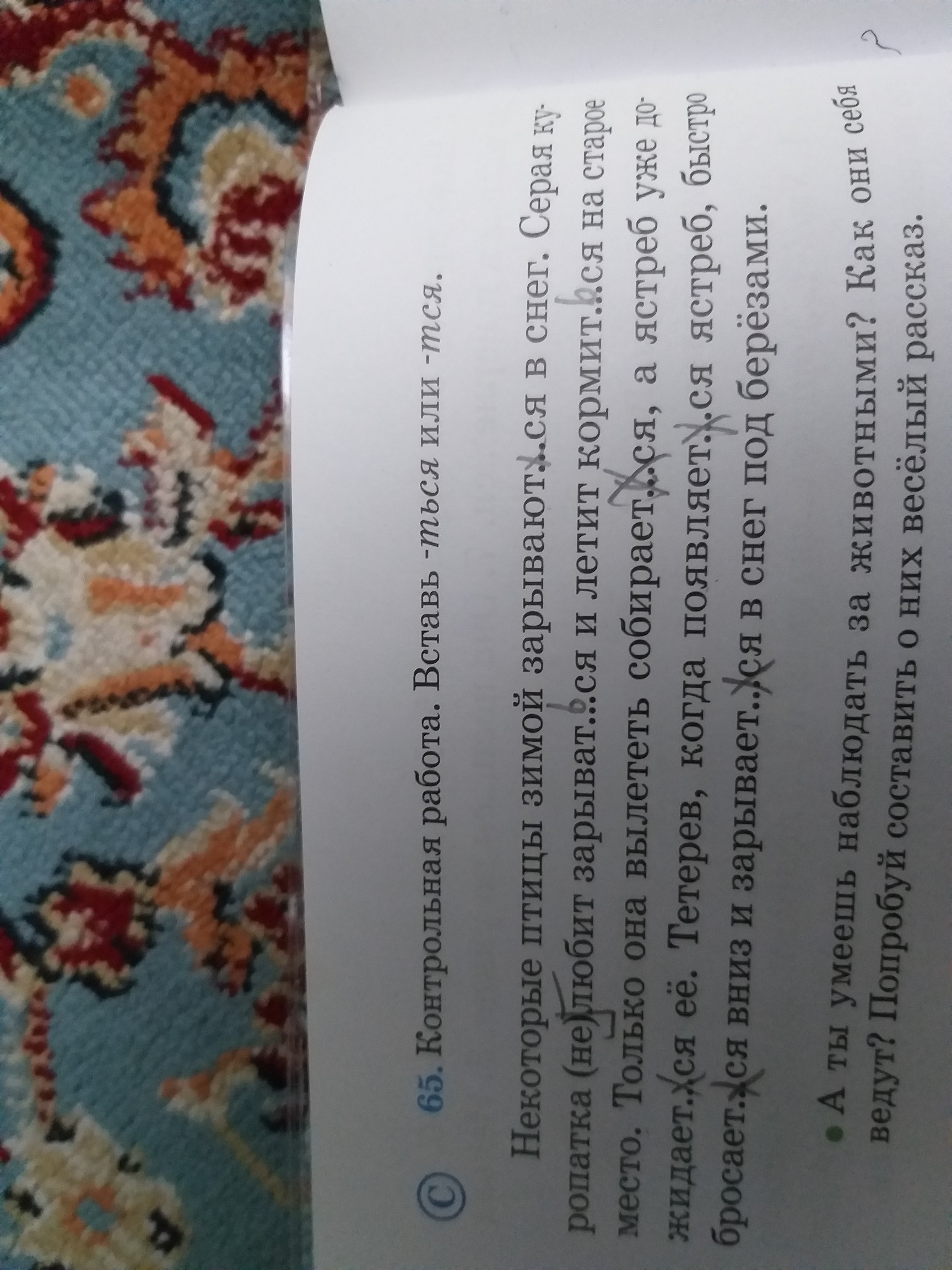Ручкой уже все отмечено: где нужно вставить мягкий знак "ь". Где не нужно, стоит крестик