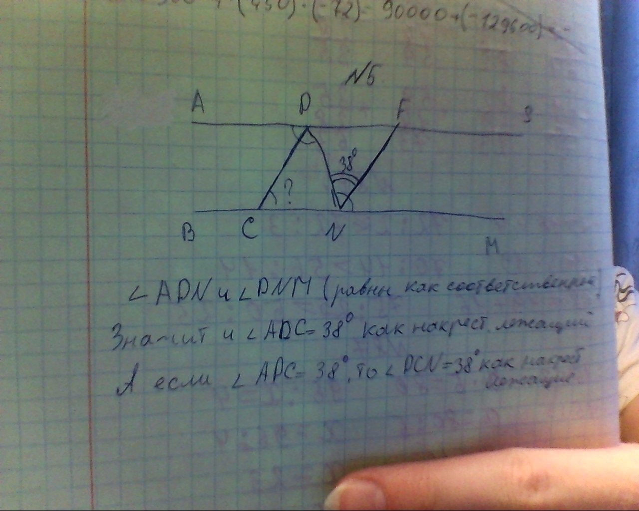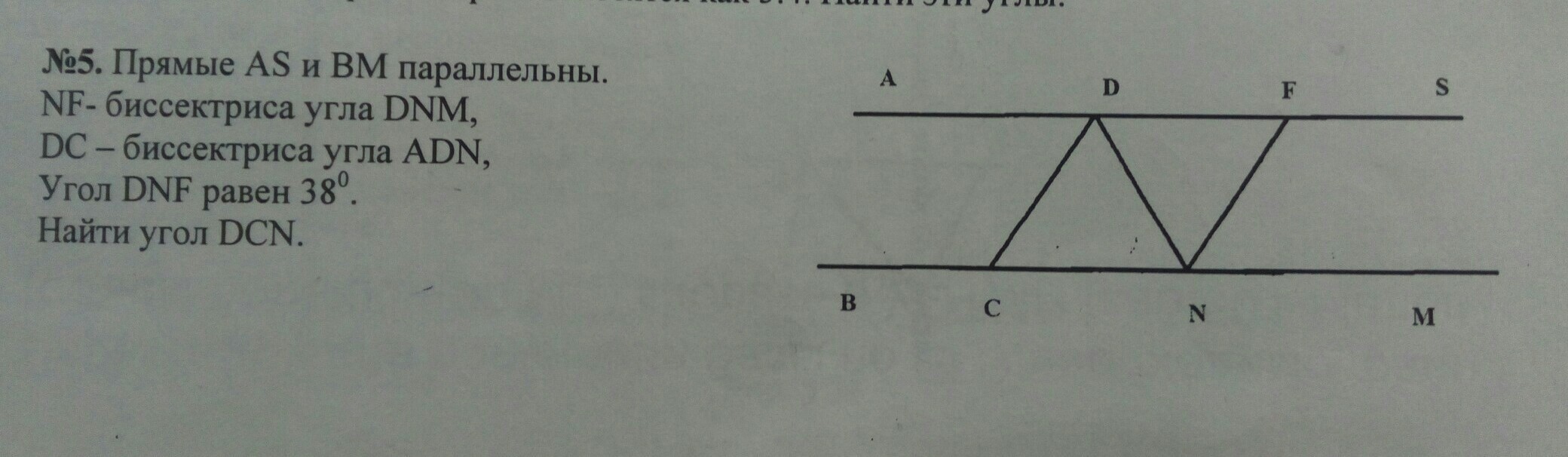 Прямые AS и BM параллельны. NF - биссектриса угла DNM, DC - биссектриса угла ADN, угол DNF равен 38°. Найти угол DCN