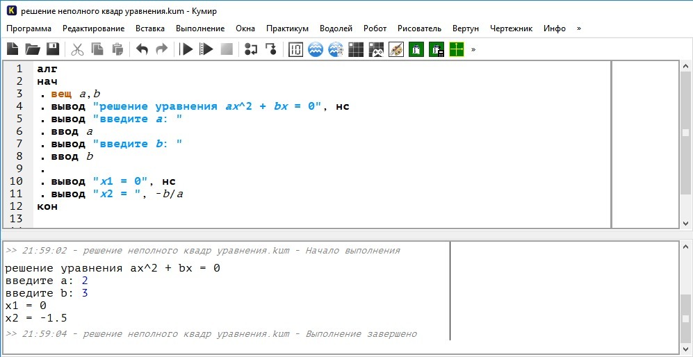 вывод "решение уравнения ax^2 + bx = 0", нс