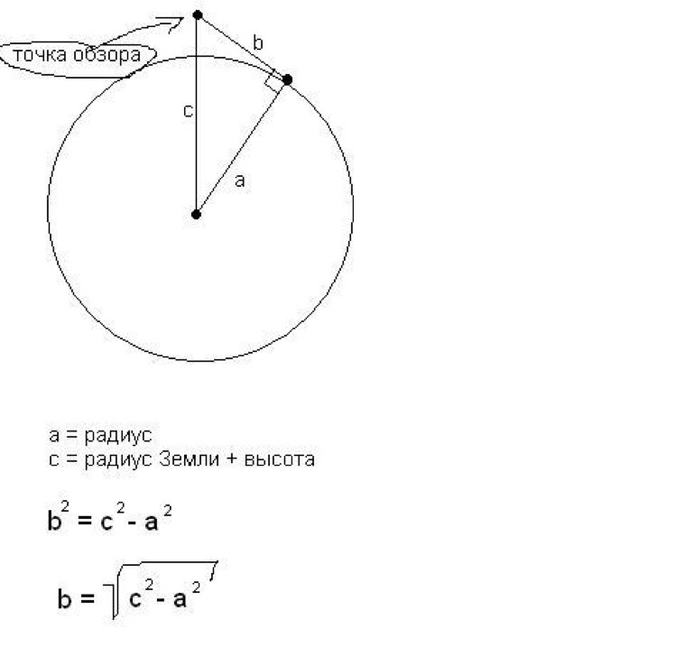 Радиус Земли равен 6370 км. Как далеко можно увидеть с самолета на высоте 4км от поверхности Земли?