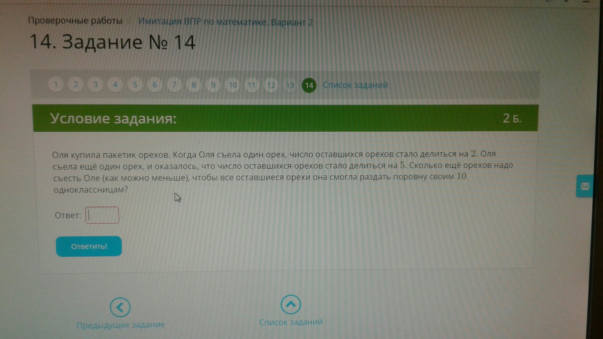 Если число орехов в начале было 17 то тогда когда Оля съела 1 орех получилось 16. 16 делится на 2 и когда она съела ещё один получилось 15. 15 делится на 5 значит нужно съесть ещё 5 орехов чтобы раздать 10 людям!