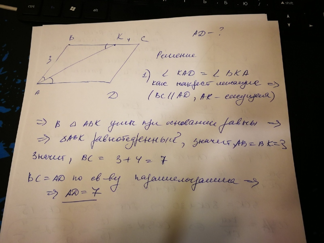 Биссектриса угла A параллелограмма ABCD пересекает BC в точке K . Найдите AD, если AB = 3, CK = 4. Пожалуйста подробно