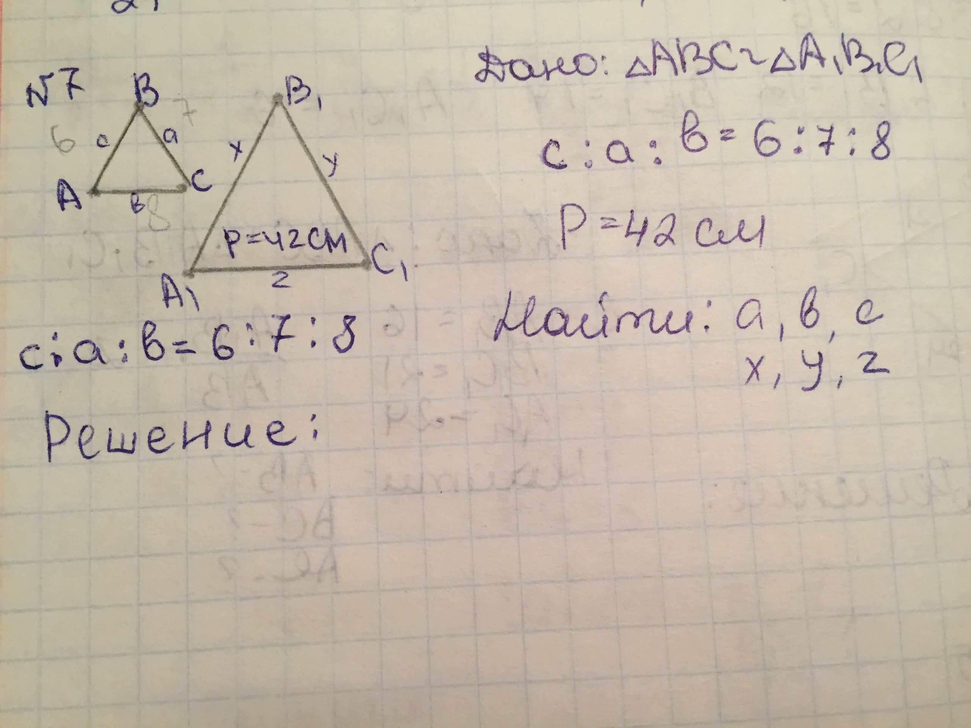 Дано: Треугольник ABC подобен треугольнику A1B1C1 ; c:a:b=6:7:8 P(A1B1C1)=42см Найти все стороны