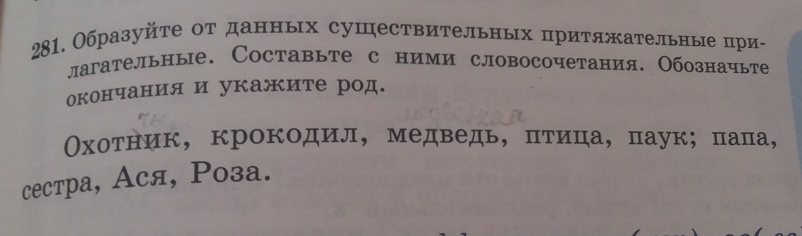 охотничий нож(м.р),крокодилья пасть(ж.р),медвежья берлога(ж.р),птичья коробка(ж.р),паучий яд(м.р); Папин галстук(м.р),сестрин шарф(м.р), Асин папа(м.р),Розин подарок(м.р)