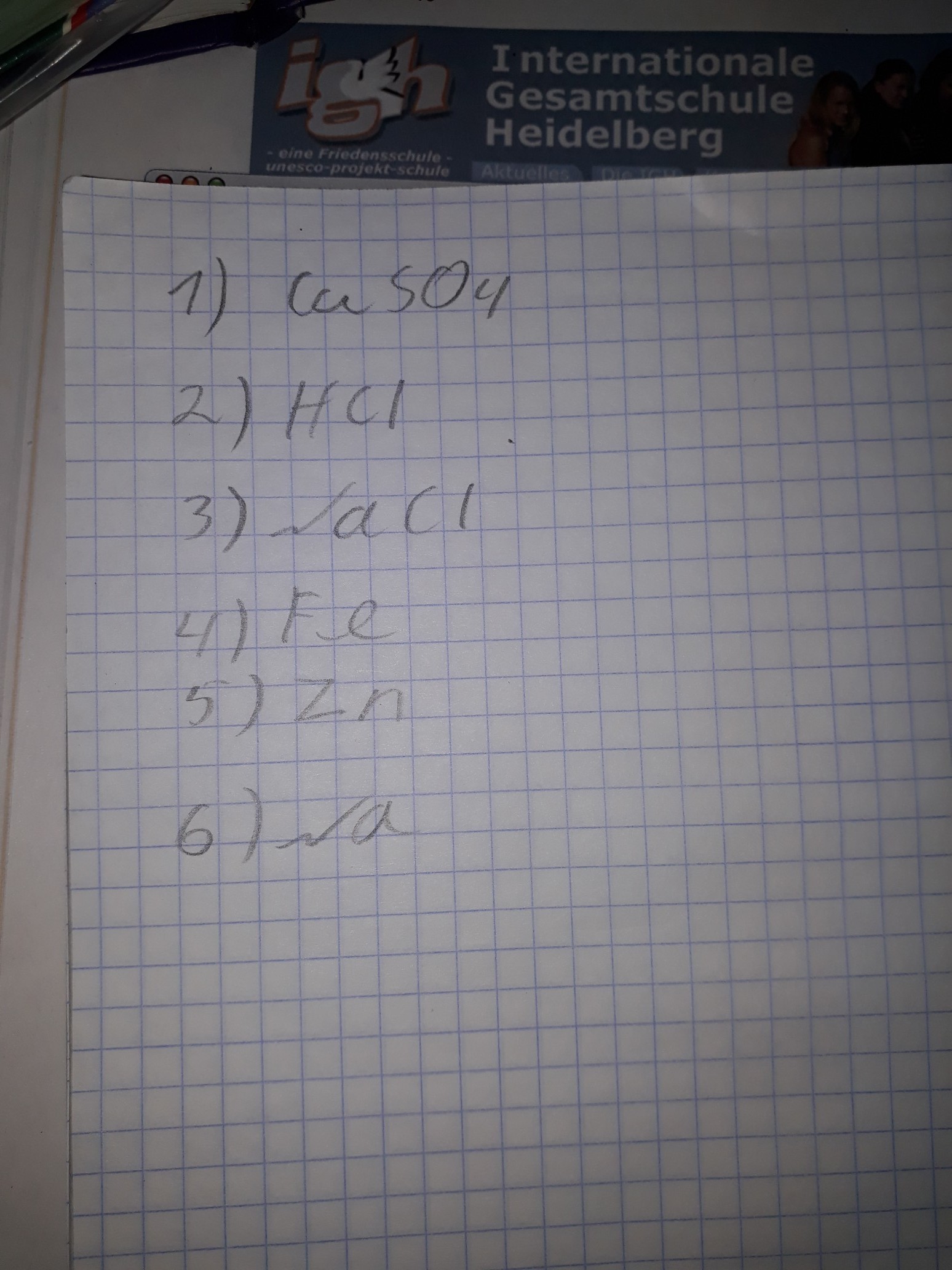 Напишите уравнения следующих веществ: сульфат меди, соляная кислота, хлорид натрия, железо, цинк, натрий.