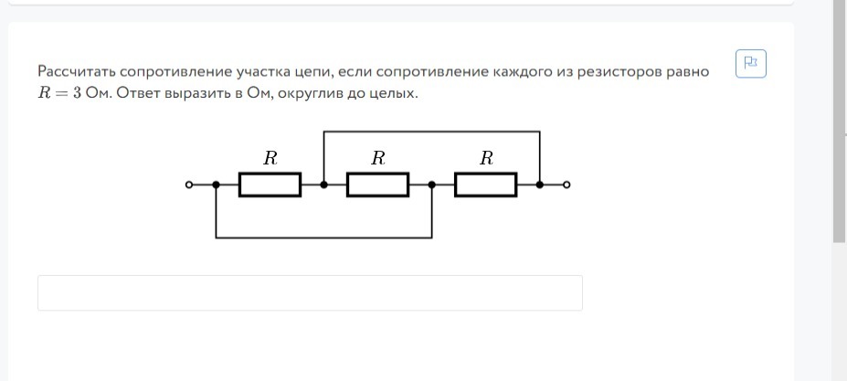 Рассчитать сопротивление участка цепи, если сопротивление каждого из резисторов равно 3 Ом. Ответ выразить в Ом, округлив до целых