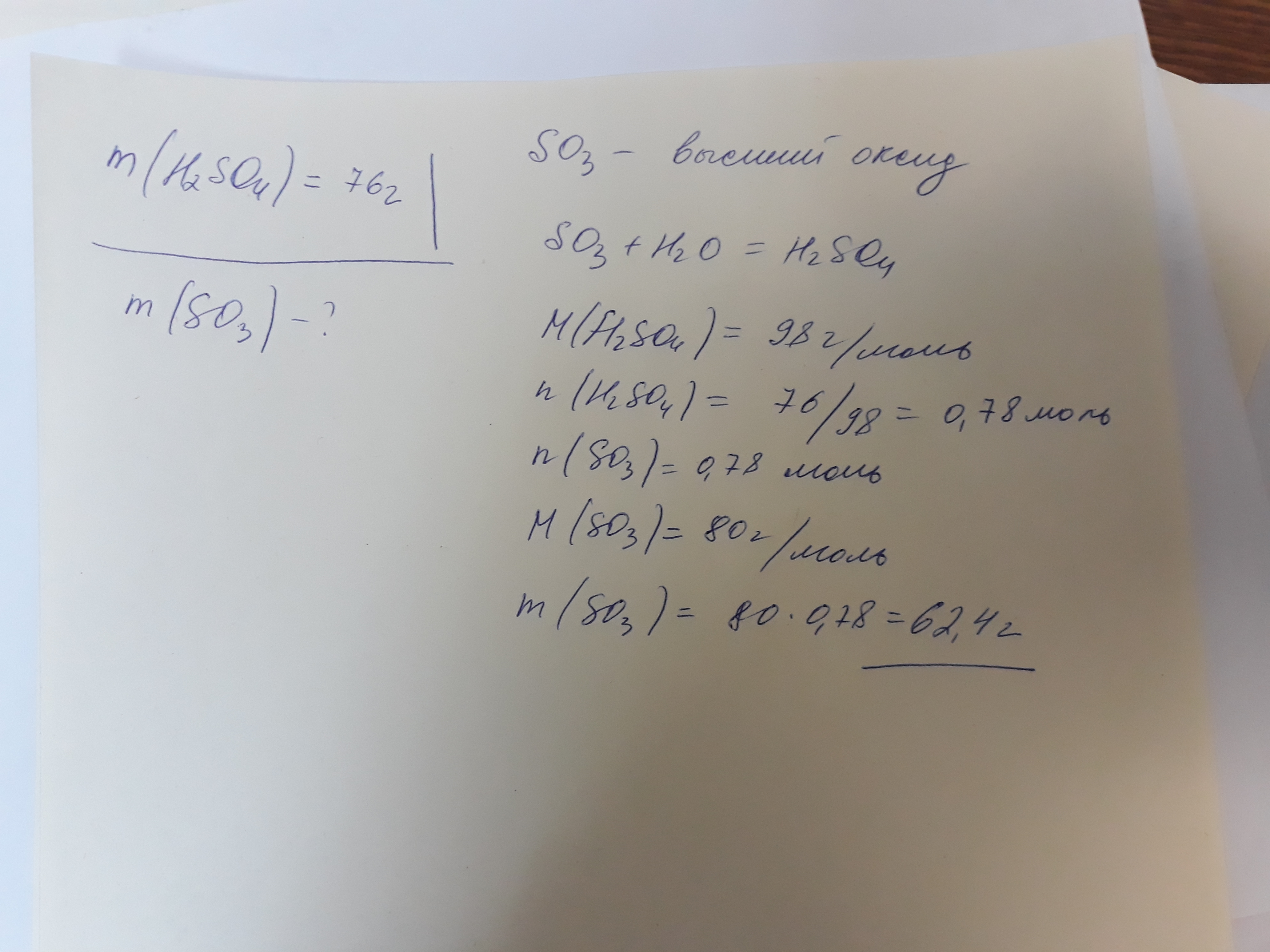 Рассчитайте массу высшего оксида серы, который прореагировал с водой с образованием кислоты, массой 76 грамм.