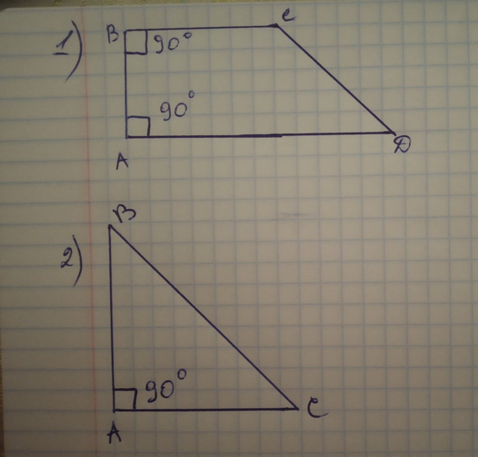 1)Начерти четырёхугольник , в котором 2 угла прямые. 2) Начерти треугольник с прямым углом . Пж можно фотку ?