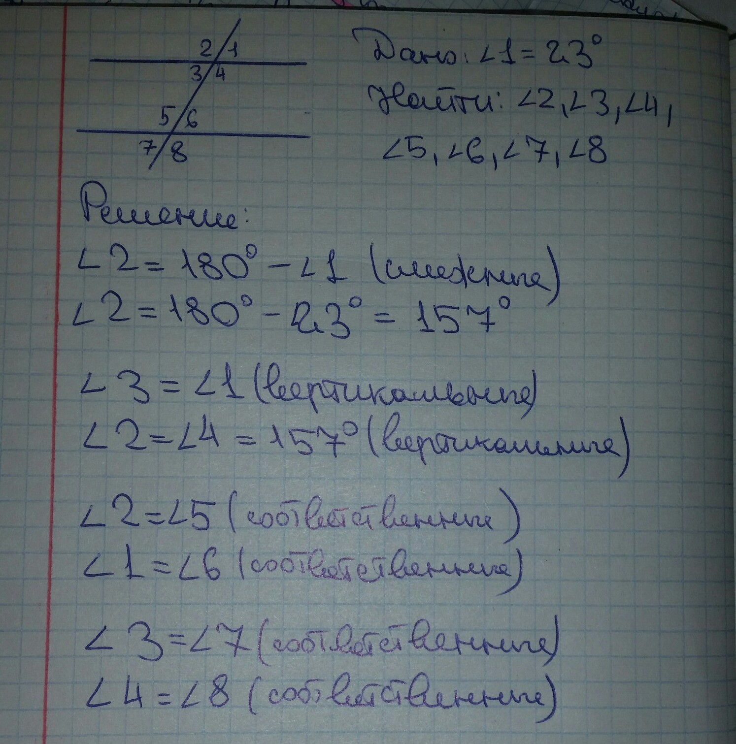 один из углов параллельных прямых и секущей равен 23 грудусов. Найди оставшиеся 7 углов пожалуйста срочно