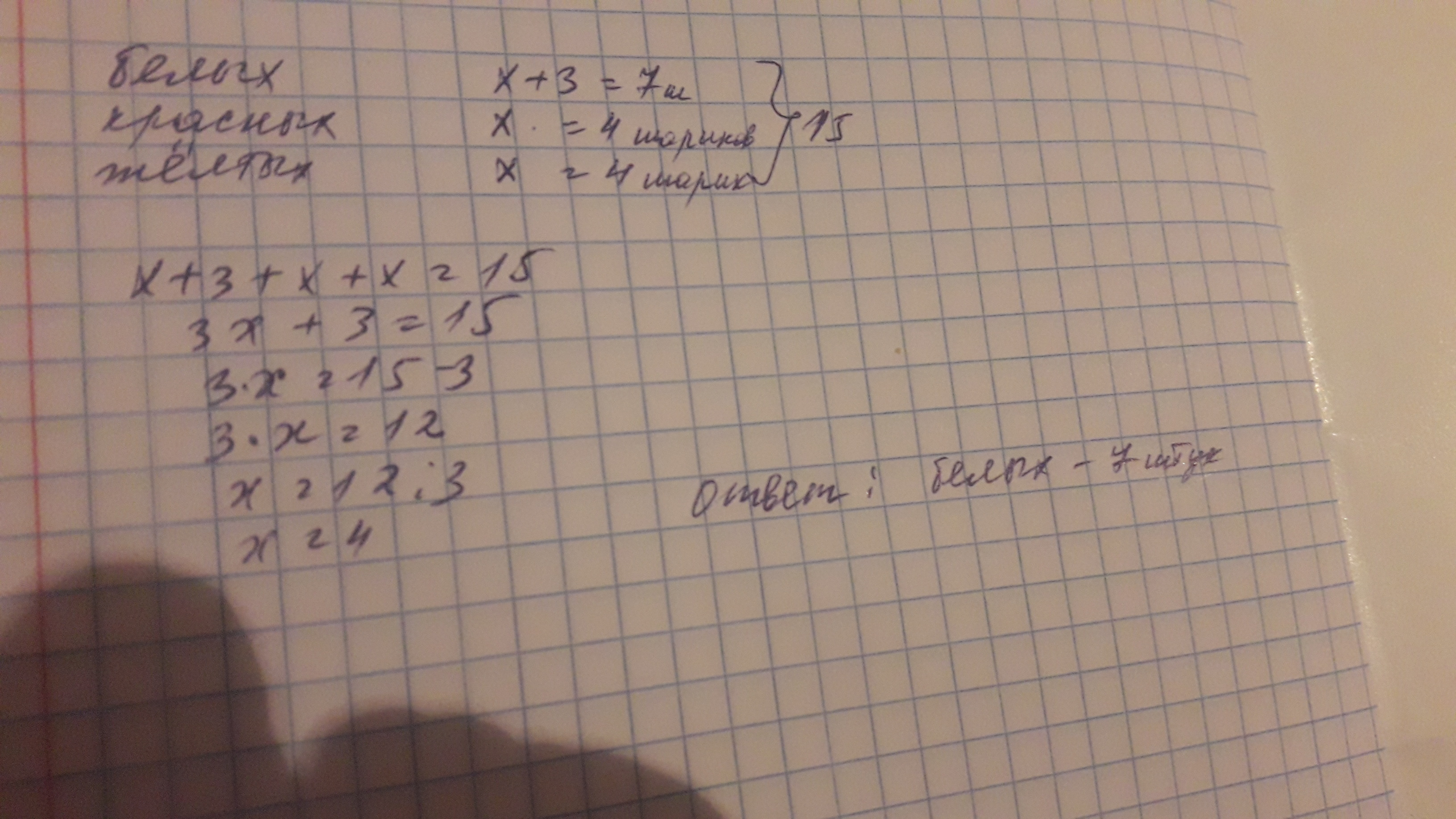 В коробке 15 шариков - белых, красных и жёлтых. Красных шариков на 3 меньше, чем белых, а жёлтых столько же, сколько красных. Сколько в коробке белых шариков?