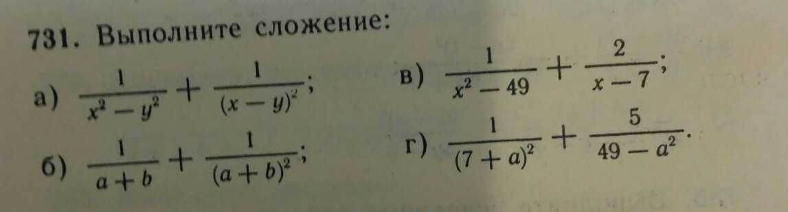 1)frac{1}{x {}^{2}  - y {}^{2} }  +  frac{1}{(x - y) {}^{2} }   \  frac{1}{(x - y)(x + y)}  +  frac{1}{(x - y) {}^{2} }  \  frac{x - y + x + y}{(x + y)(x - y) {}^{2} }  \  frac{2x}{(x + y)(x - y)(x - y)}  \  frac{2 x}{(x {}^{2}  - y {}^{2} )(x - y)}  =  frac{2x}{x {}^{3} - x {}^{2} y - xy {}^{2} + y {}^{ 3}   }  \ 2) frac{1}{a + b}  +  frac{1}{(a + b) {}^{2} }  \  frac{(a + b) times 1}{(a + b)(a  +  b)}   +  frac{1}{(a + b) {}^{2} }  \  frac{a + b}{(a + b) {}^{2} }  +  frac{1}{(a + b) {}^{2} }  =  frac{a + b + 1}{(a + b) {}^{2} }  \ 3) frac{1}{x {}^{2}  - 49}  +  frac{2}{x - 7}  \  frac{1}{(x - 7)(x + 7)}  +  frac{2}{x - 7}  \   frac{1 + 2(x + 7)}{(x - 7)(x + 7)}  \  frac{1  + 2x + 14}{x {}^{2}  - 49}  =  frac{15 + 2x}{x {}^{2}  - 49}  \ 4) frac{1}{(7 + a) {}^{2} }  +  frac{5}{49 - a {}^{2} }  \  frac{1}{(7 + a) {}^{2} }  +  frac{5}{(7 - a)(7 + a)}  \  frac{7 - a + 5(7 + a)}{(7 - a)(7 + a) {}^{2} }  \  frac{7 - a + 35 + 5a}{(7 - a)(7 + a)(7 + a) }  \  frac{42 + 4a}{(49 - a {  }^{2} )(7 + a)}  \  frac{42 + 4a}{343 + 49a - 7a {}^{2}  - a {}^{3} }
