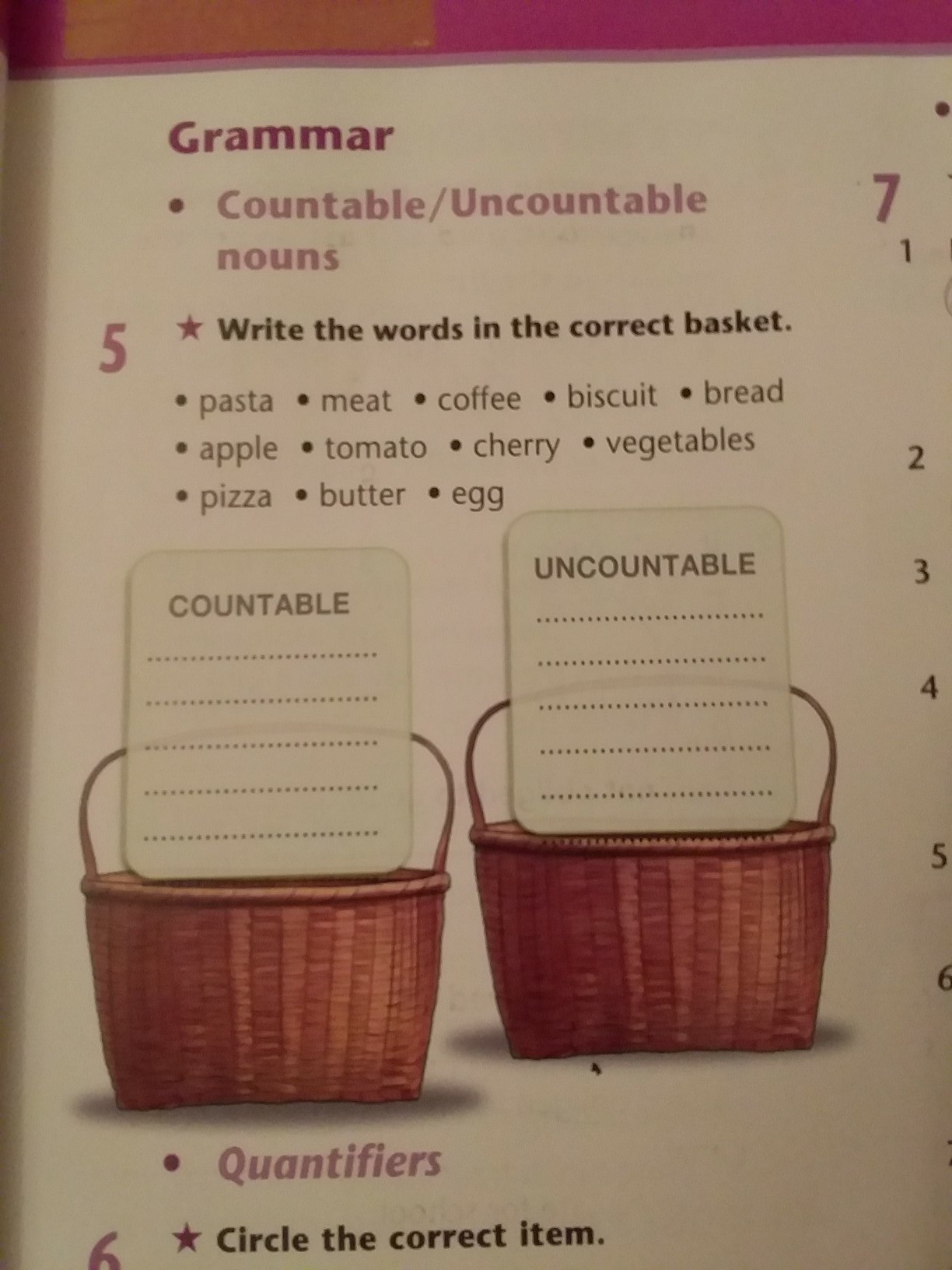Uncountable: pizza, bread, pasta, Meat, coffee, vegetables, butter