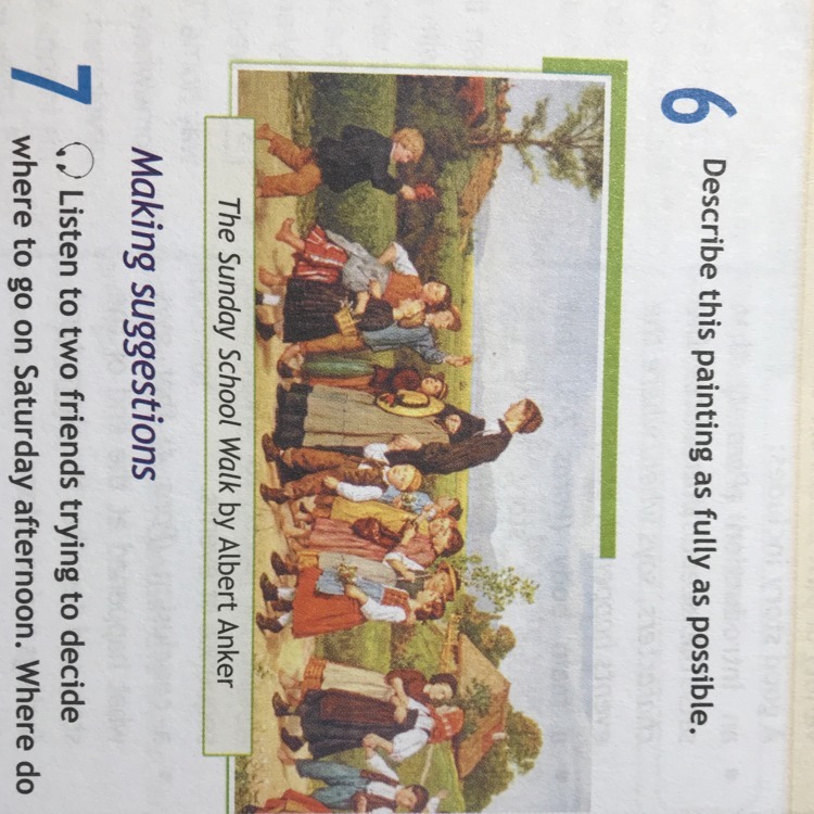 In the picture we can see a woman and a lot of children. They’re wearing light clothes, so I’m sure that it’ spring or chilly summer. The children are talking about something and it seems like they are telling something to the woman. I reckon that she is a teacher, because the picture is called “The Sunday School Walk”. The girls are wearing beautiful casual dresse, boys are wearing jackets and trousers. Actually I think that walks like that are great. Also the background is bright and colorful. In my opinion it’s a countryside, because there is nice environment.