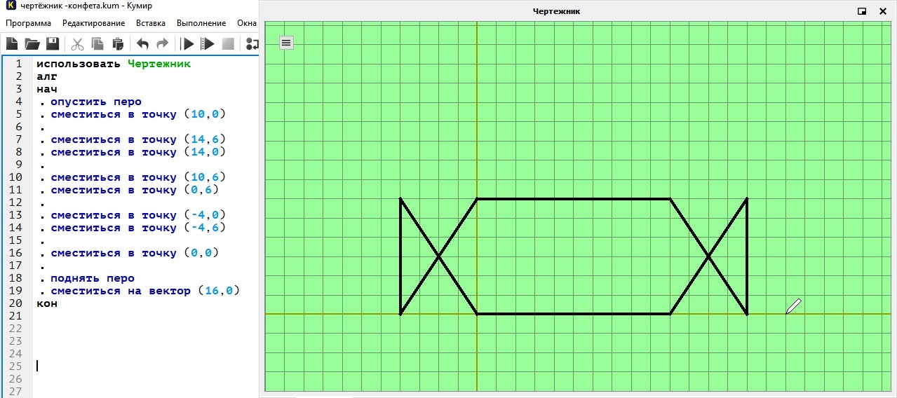 Помогите по информатике! Кумир алгоритм конфета, сделайте начало и конец. Пример: поднять перо,опустить перо спуститься (6,7)