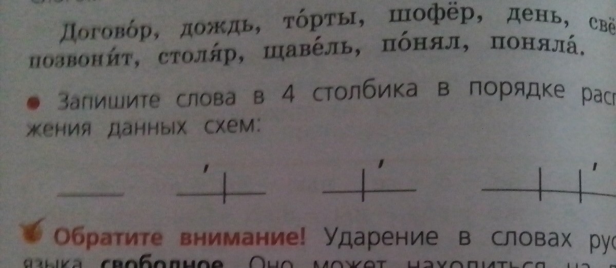 Запишите слова в 4 столбика в порядке расположения данных схем: Договор дождь торты шофёр день свёкла позвонит столяр щавель понял поняла. помогите пожалуйста