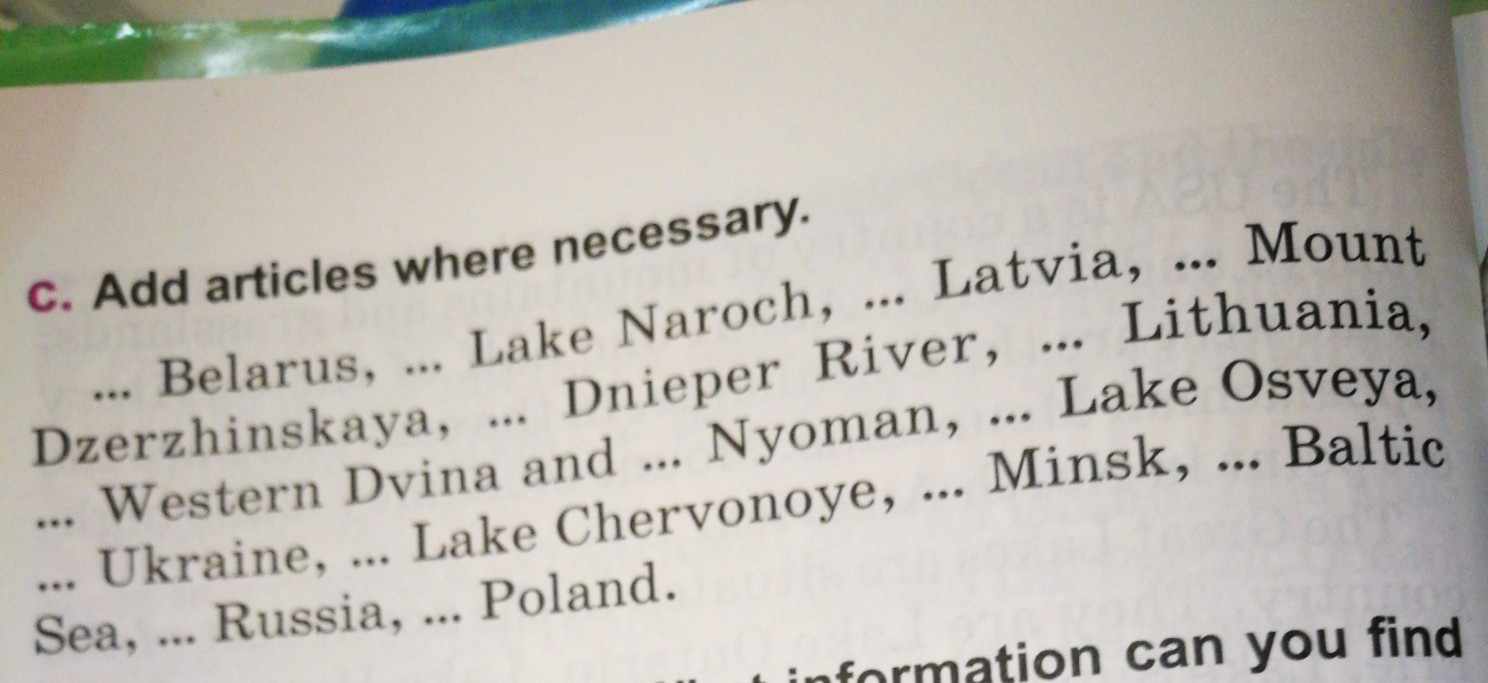 Belarus, Lake Naroch, Latvia, Mount Dzerzhinskaya, the Dnieper River, Lithuania, the Western Dvina and the Nyoman, Lake Osveya, Ukraine, Lake Chervonoye, Minsk, the Baltic Sea, Russia, Poland.