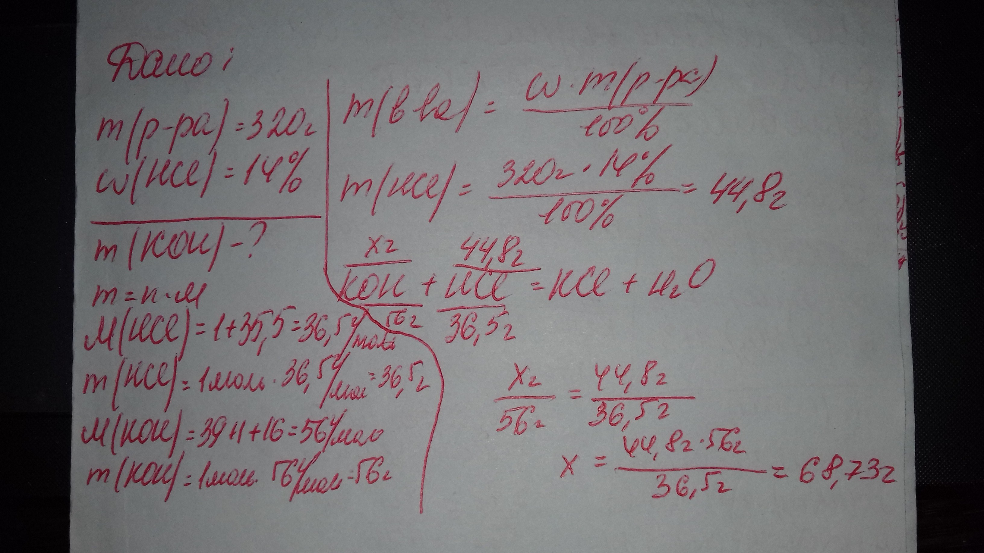 Рассчитайте массу гидроксида калия необходимую для полной нейтрализации 320 г раствора соляной кислоты с массовой долей кислоты 14%.