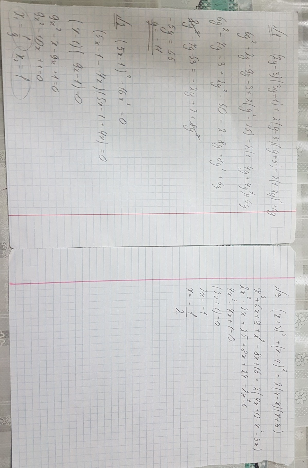 Решите уравнения : 1). (2у-3)(3у+1)+2(у-5)(у+5)=2(1-2у)^2+6у