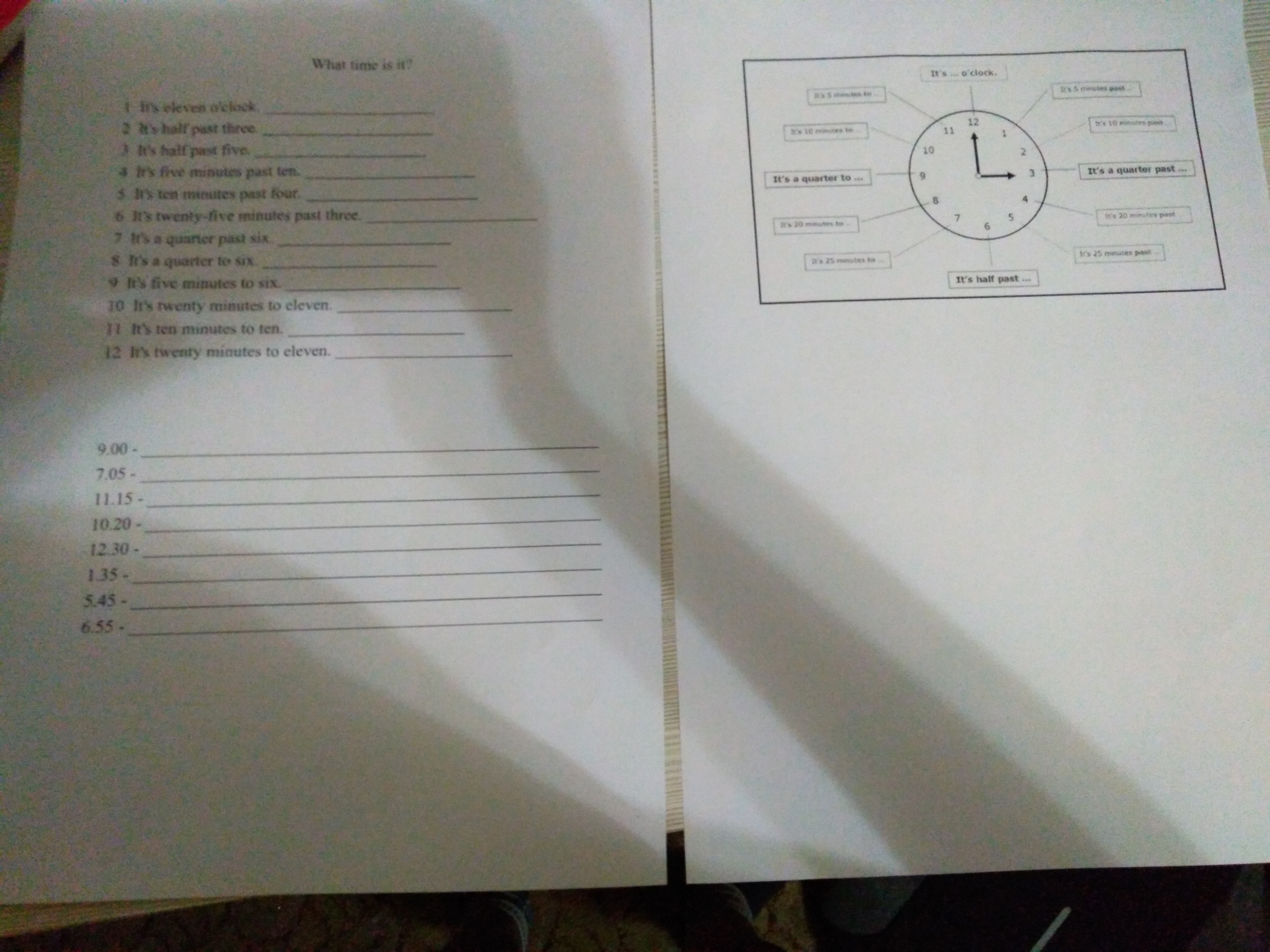 Nine o'clock, five past seven, quarter past eleven, twenty past ten, half past twelve, twenty-five to two, quarter to six, five to seven