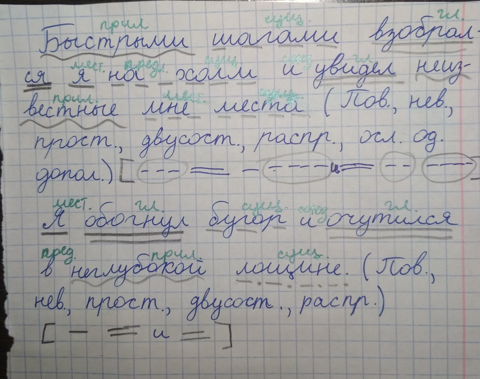 подлежащее я сказуемое взобрался и увидел определение быстрыми неизвестные дополнение шагами на холм места. второе предложение подлежащее и сказуемое обогнул и очутился дополнения бугор лощине определение в неглубокой