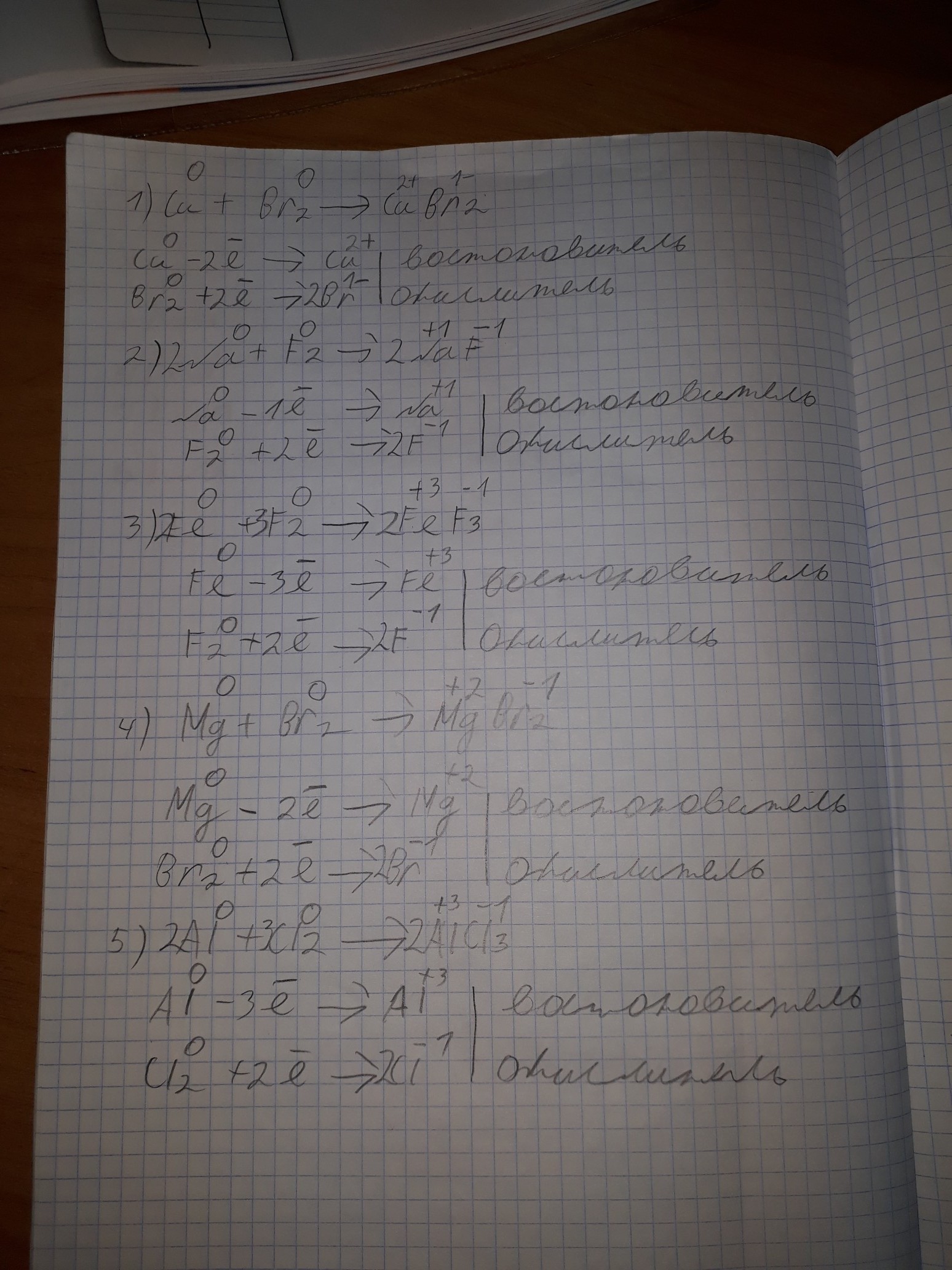 Напишите уравнения окисления-восстановления,укажите окислитель и восстановитель, когда реагируют: медь с бромом;натрий с фтором;железо с фтором;магний с бромом;алюминий с хлором.