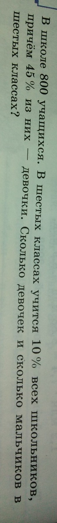10% от всех учащихся это ученик 6 классов то значит 800×0.1=80. Если мы теперь 80 берём как 100% то 45% будет 80×0.45=36, и теперь 80-36=44, то у нас получиться 36 девочек и 44 мальчиков