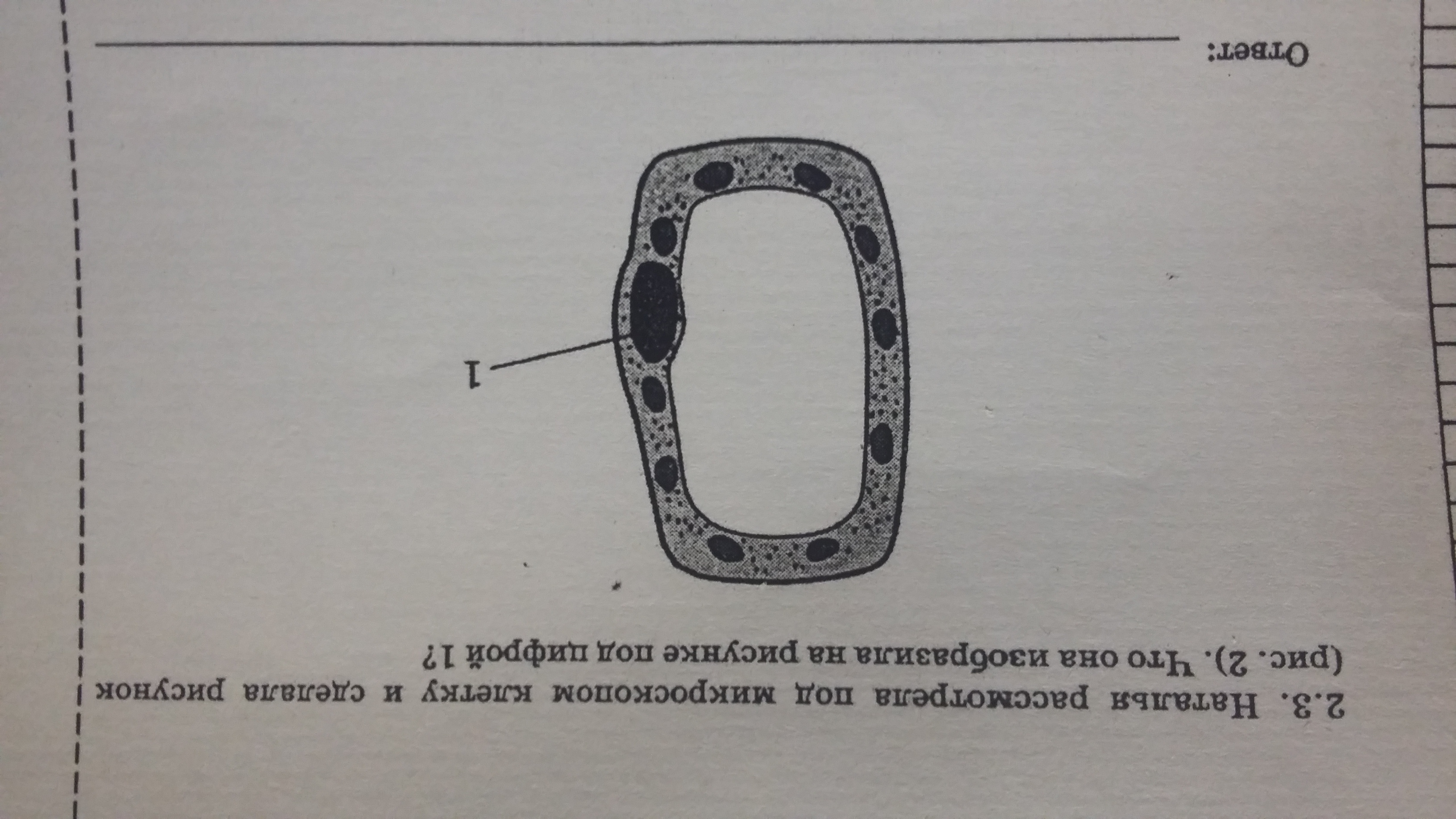 Это растительная клетка, под номером 1 ядро, белое это вакуоль, а маленькие точки хлоропласты.