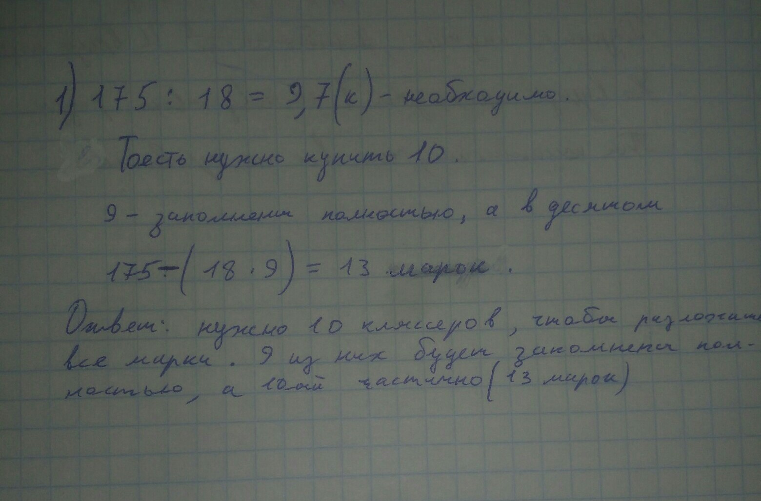 Саше надо разложить 175 марок по кляссерам. В продаже имееются только кляссеры, вмещающие 18 марок. Склько таких кляссеров ему необходимо приобрести, чтобы разложить все марки ? Окажется ли среди них неполный, а если да, то сколько будет в него поместить?
