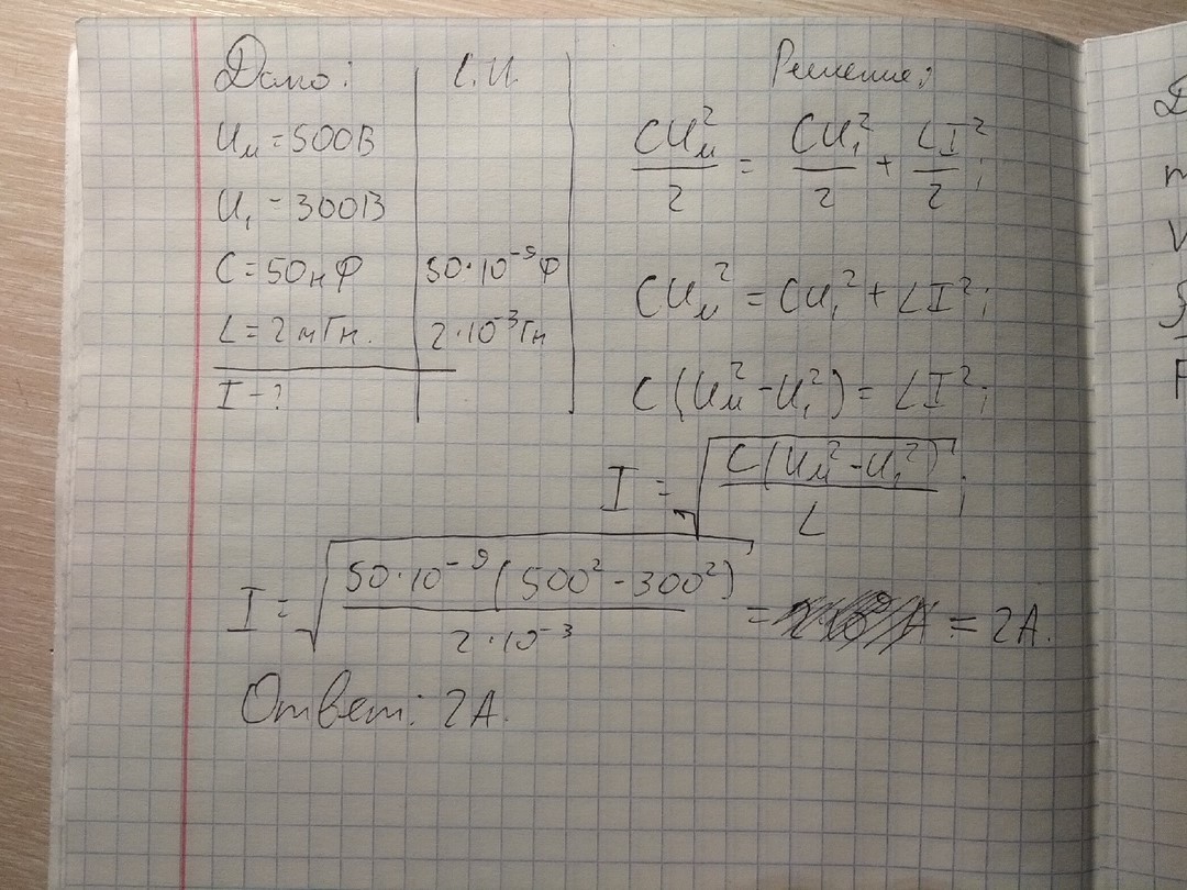 Какой будет сила тока на катушке индуктивности в тот момент времени, когда на конденсаторе в идеальном колебательном контуре напряжение равно 300 В? Изначально конденсатор был заряжен до 500 В, его емкость 50 нФ, а индуктивность катушки 2 мГн.