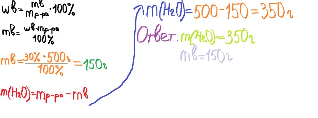 Найдите массу вещества и массу воды, если массовая доля соли в растворе 30 процентов, масса раствора 500 грамм.