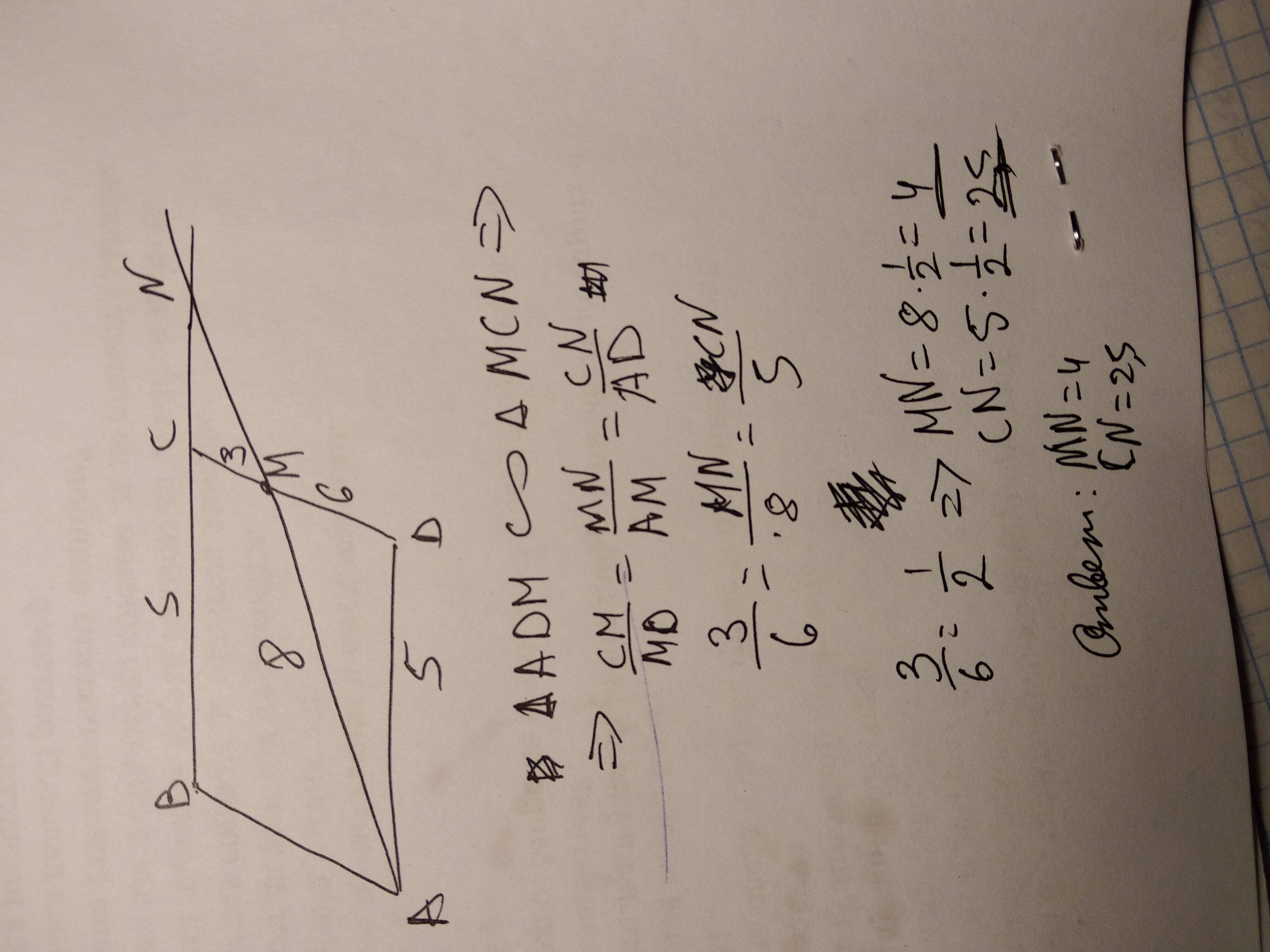 На стороне CD параллелограмма отмечена точка M. Прямые AM и BC пересекаются в точке N. Найдите MN и CN если DM=6 MC=3 BC=5 AM=8