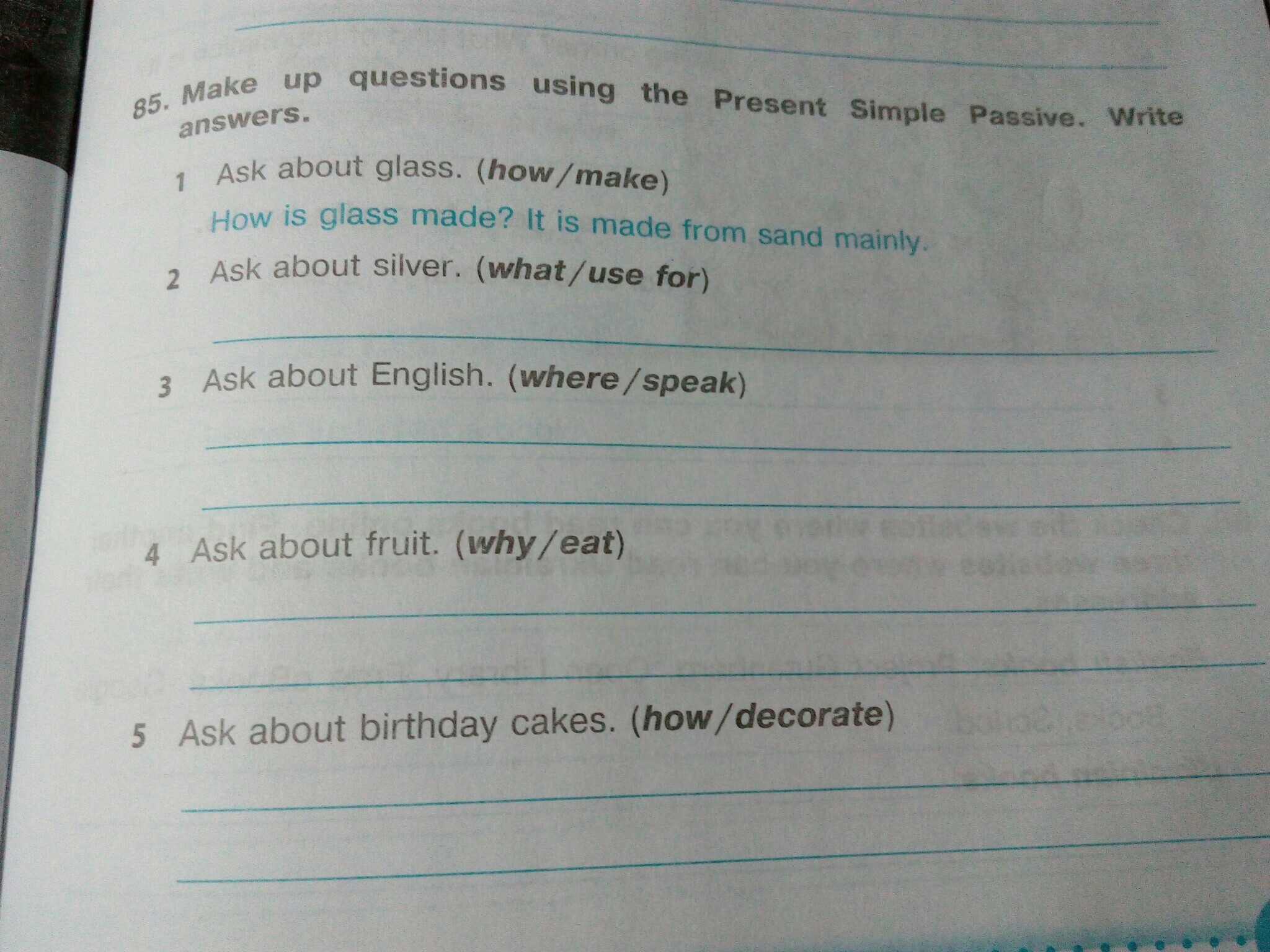 2. what silver is used to? Silver is used in clutery (flatware) manufacturing 3.where English language is spoken to? It is spoken in the UK, the USA, Canada, Australia and New Zealand 4. Why do people eat fruts. People eat fruts to keep fit. 5. How birthday cakes is being decorated. Birthday cakes is being decorated with cream.